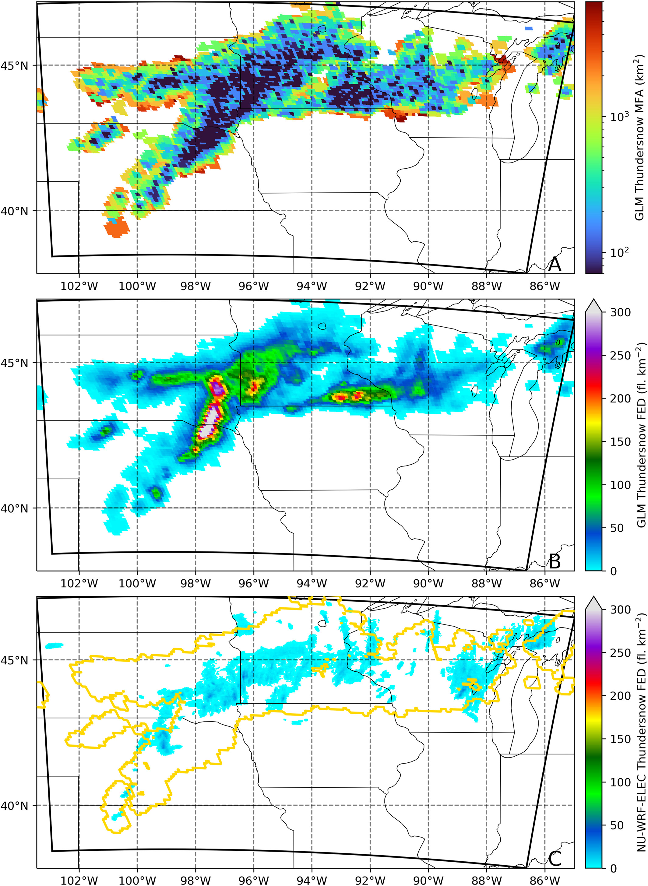 (A) minimum flash area and accumulated flash extent density (FED) between 00 UTC 10 April 2019 and 06 UTC 12 April 2019 for (B) thundersnow flashes observed by the GOES-16 Geostationary Lightning Mapper (GLM) and for (C) simulated thundersnow flashes. The gold contour represents the spatial extent of the GLM gridded observations of thundersnow. Figure from Harkema et al., 2024.