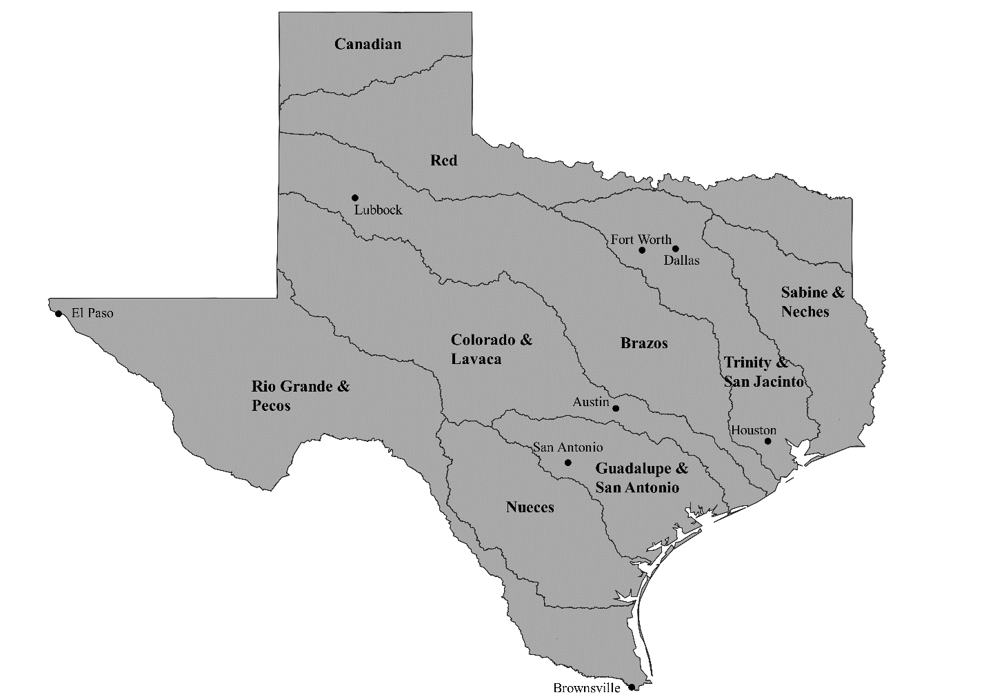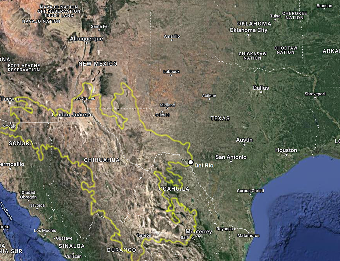 Above: A map of Texas river drainages, including the Rio Grande (Río Bravo del Norte), whose main course also forms the natural border between Texas and Mexico. Map by Cody Craig, Texas State University. Below: This map shows Del Rio, Texas, situated at the overlapping boundaries of the Chihuahuan Desert, the Texas border, and the Rio Grande. The Río Bravo originates in the rugged San Juan Range of the Colorado Rockies and flows south into the Gulf of Mexico at Brownsville, Texas. Satellite maps by Google.