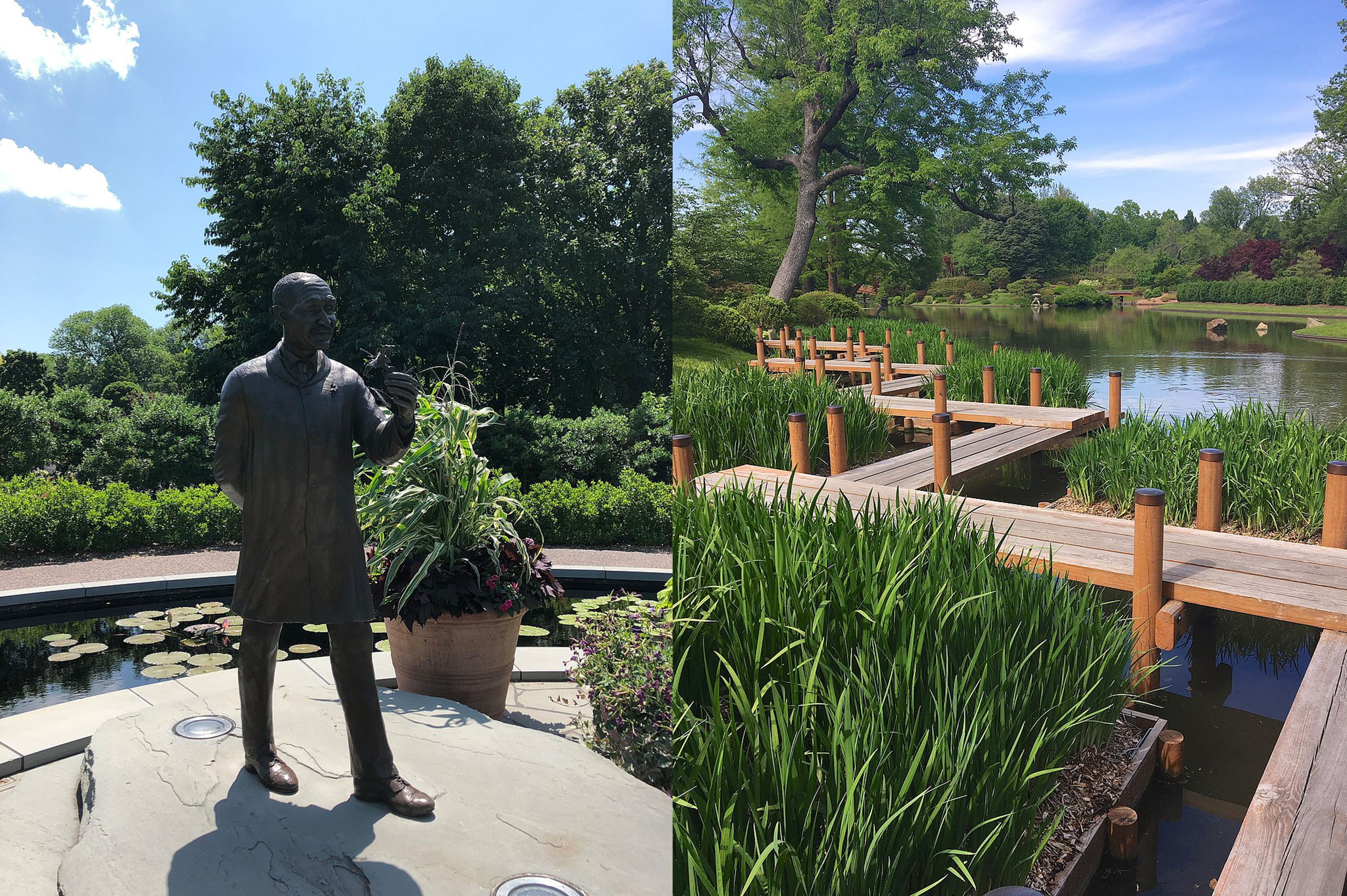 Images from the Missouri Botanical Garden. At left: A statue of scientist George Washington Carver, an innovative botanist and influential agriculturalist. Photograph by Paulmcdonald, CC BY-SA 4.0, via Wikimedia Commons. At right: A yatsu-hashi bridge (walkway over a pond) made of eight overlapping wooden planks in the Japanese Garden. Photograph by John Mackenzie Burke, CC BY-SA 4.0, via Wikimedia Commons.