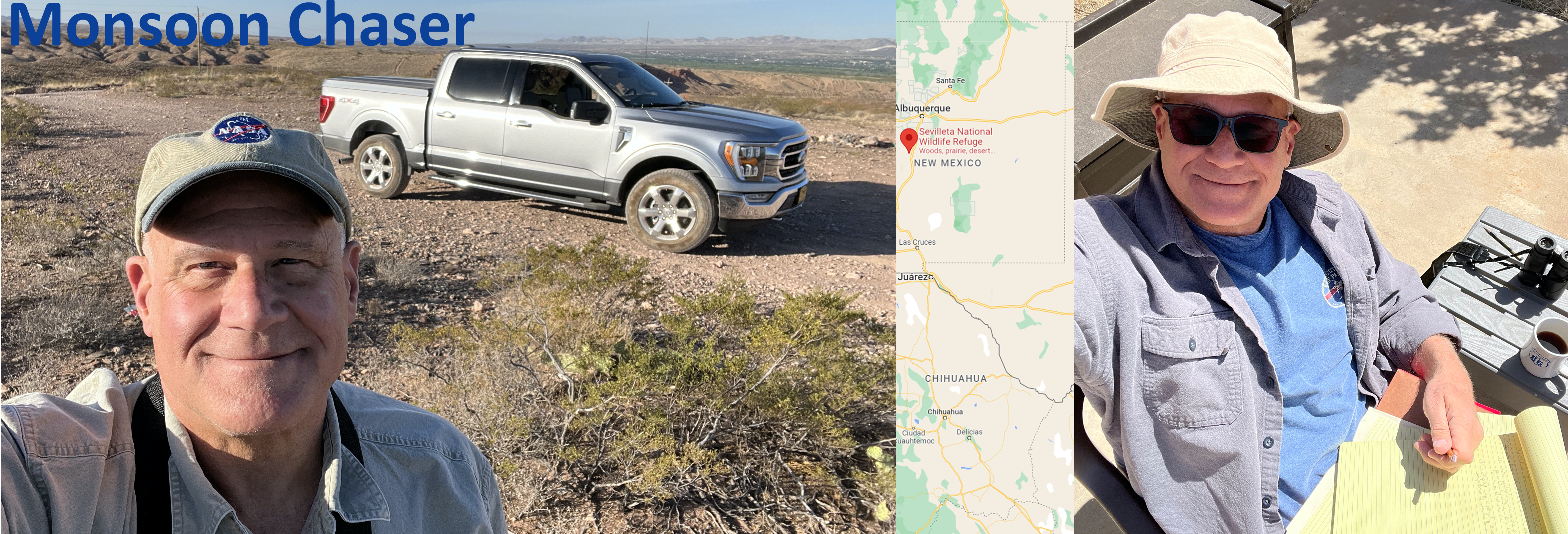 Left: John Schnase driving the North American Breeding Bird (BBS) survey routes in the Chihuahuan Desert of New Mexico in summer 2022. Right: Conducting fieldwork at the Sevilleta NWR near Socorro, New Mexico. NASA photos.