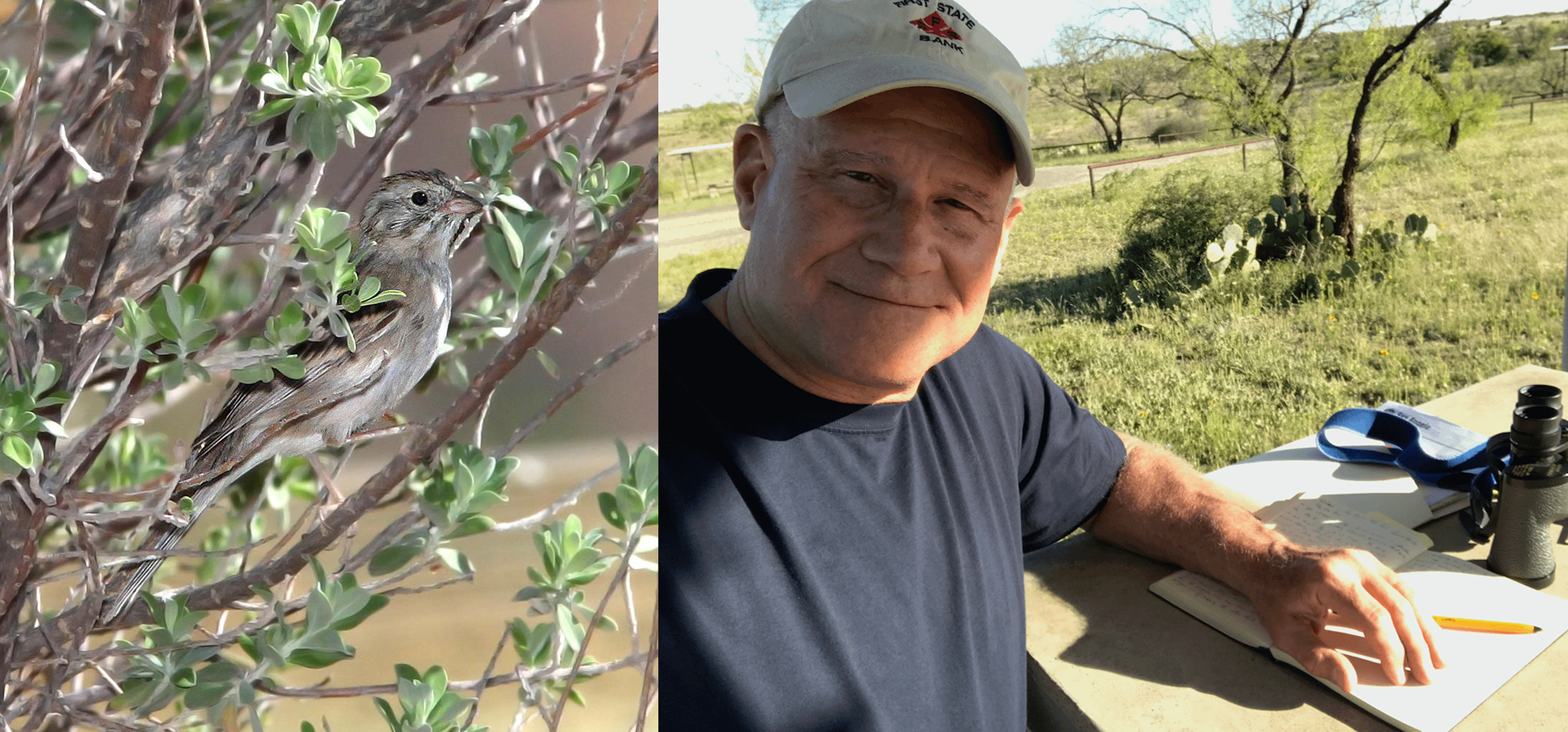 Left: Cassin’s Sparrow camouflaged in a shady bush in Patagonia, Arizona, on 27 April 2011. Photograph by Alan Schmierer via Flickr. Right: Dr. John Schnase conducting fieldwork in San Angelo, Texas, in 2020. NASA photo.