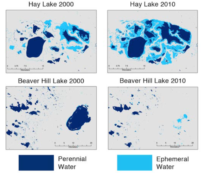 (top) and decline (bottom) of two lakes in Alberta, Canada.