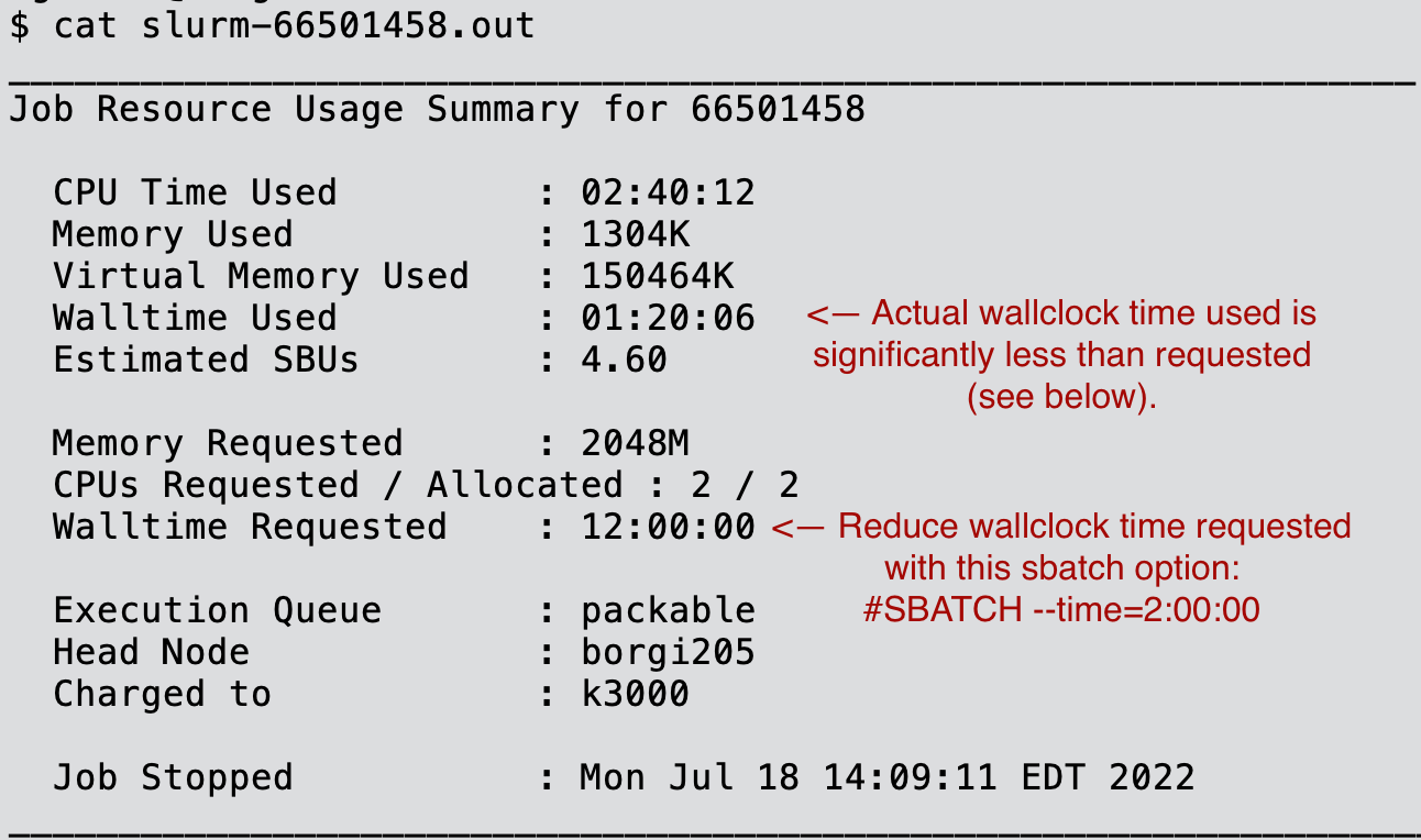 Solution: Check your job summary report in your job's standard output/error file (goes to slurm-