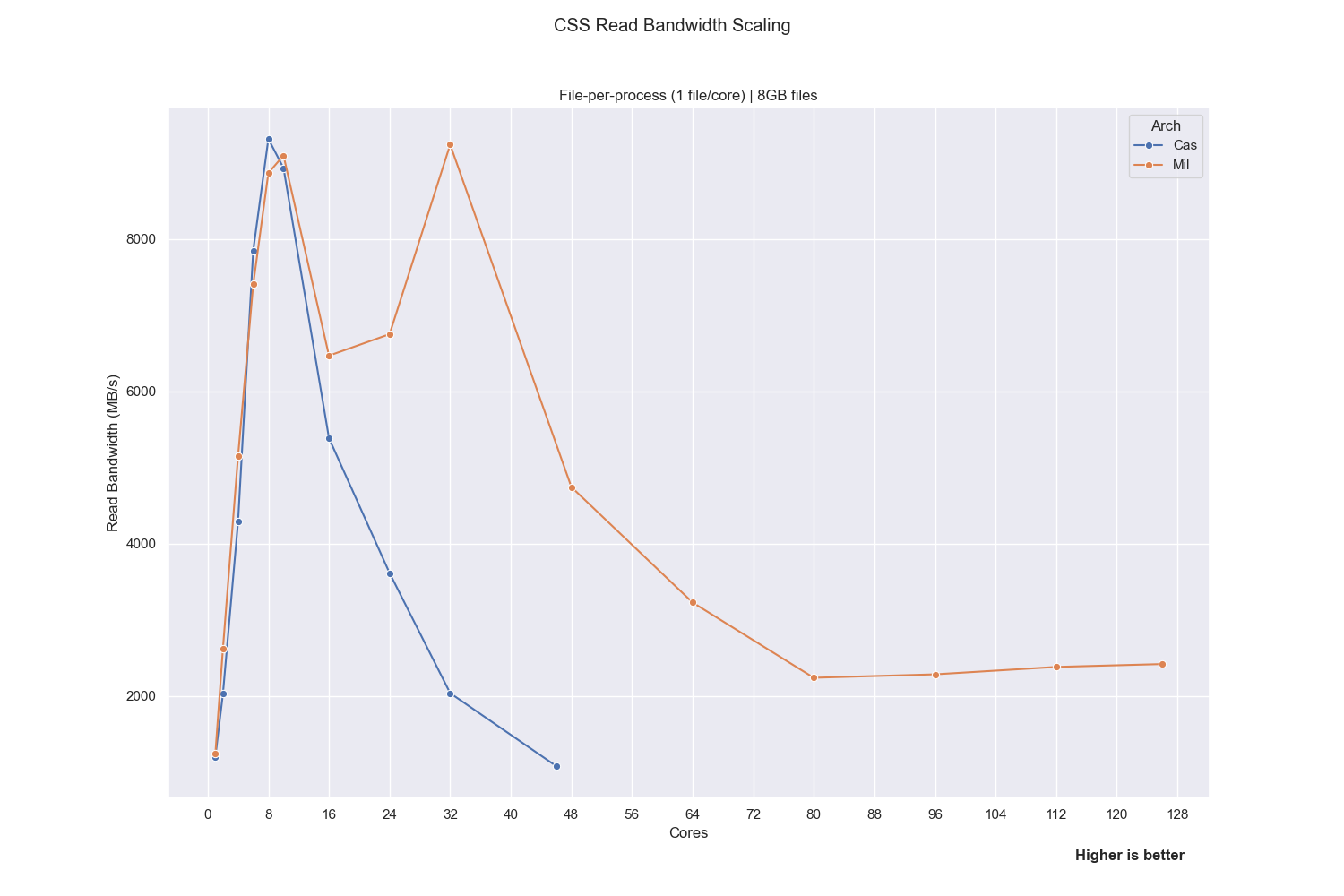 To maintain higher bandwidth, use fewer than 12 cores/processes when performing read operations. CSS is a NFS filesystem that does not support robust parallelization. Internal testing has shown that reading from CSS with more than 12 cores can degrade bandwidth significantly.